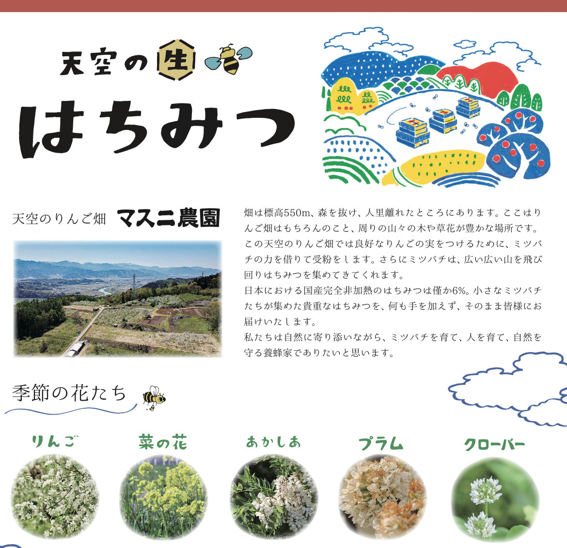 数量限定販売のりんごの花のはちみつです。濃厚な甘みとりんごの花の香りがふわっと香るコクが特徴です。国産のはちみつ採取量が減る中、貴重なマスニ農園のりんごの花のはちみつを味わってください。